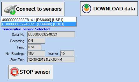 * Water-tight temp sensor/logger. Readings recorded in sensor memory. |